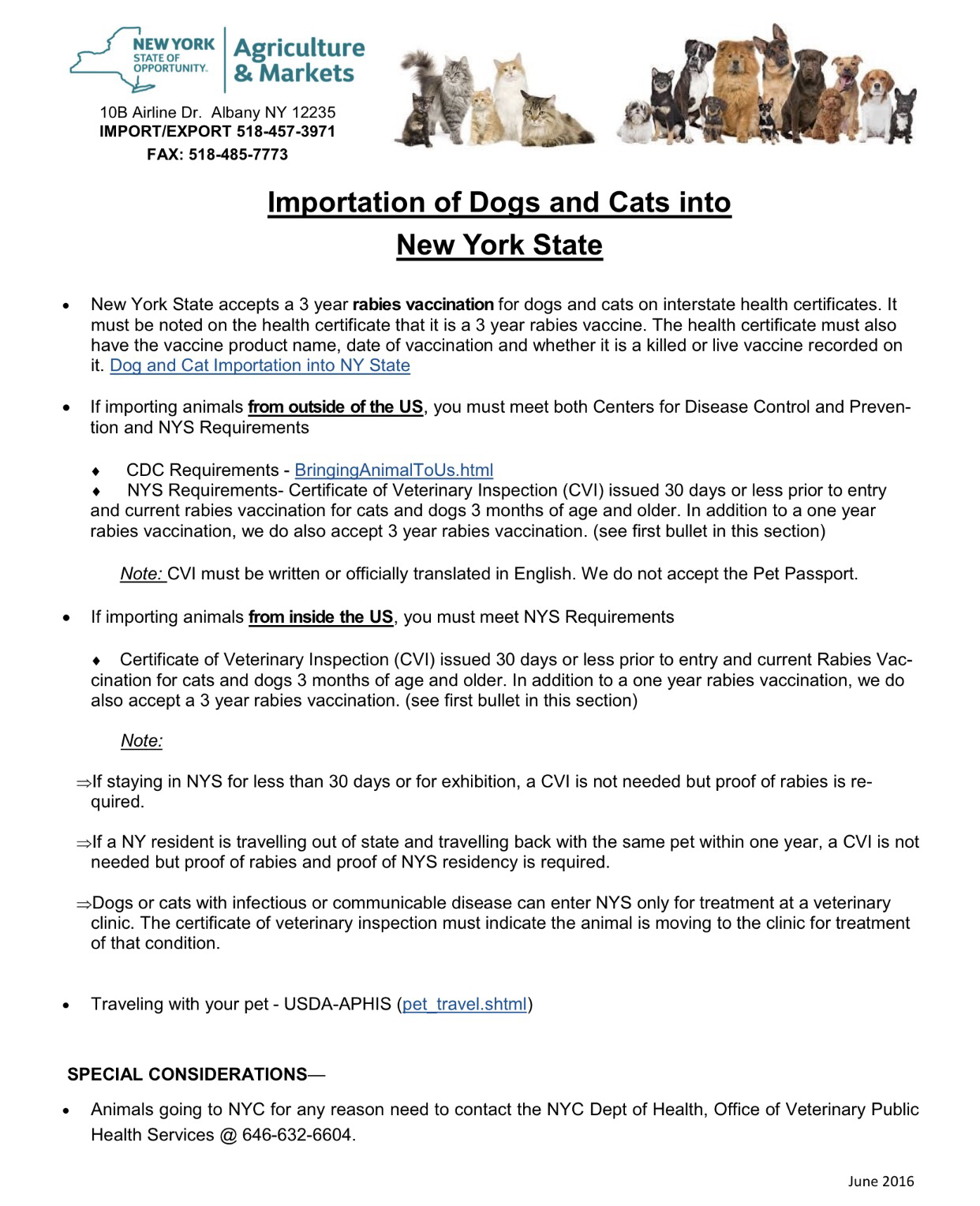 Here are already some usefull information for people travelling with their pets to NYS and NYC: